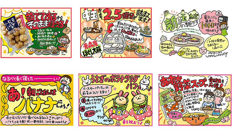 店頭を彩るPOPを制作いたします。「手描き」「手描きと写真の合成」「文字だけはフォント使用」などお好みに合わせて対応可能です。手描きの線にによる温かみとPCによる発色の良さが特徴です。